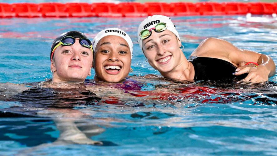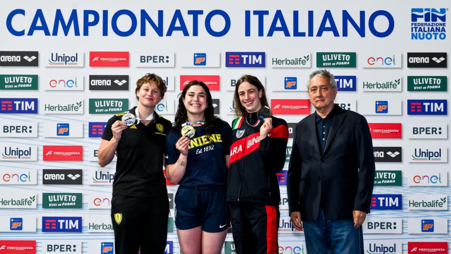 CURTIS QUATERNA. La star degli Assoluti Unipol è certamente Sara Curtis che, dopo i successi nei 50 dorso e nei 50 stile libero coi record italiani e nei 100 stile libero, si prende i 50 farfalla con il personale di 25"89. La 19enne di Savigliano - tesserata per Esercito e CS Roero, allenata alla Virginia Univeristy da Todd DeSorbo - scende per la prima volta in carriera sotto i 26", abbassando il 26"52 siglato in batteria, che aveva a sua volta mandato in archivio il 26"96 datato 2024. In scia alla velocista azzurra c'è solo la primatista italiana (25"49) e capitana azzurra Silvia Di Pietro. La 33enne di Roma - tesserata per Carabinieri e CC Aniene, preparata da Mirko Nozzolillo - nuota in 26"09 a dieci centesimi dal limite europeo (25"9). Terza, più staccata, Elena Capretta (Fiamme Oro/CC Aniene) in 26"35. "Concludo come meglio non avrei potuto i miei Assoluti - spiega Curtis, preparata in Italia da Thomas Maggiora - Adesso staccherò per qualche giorno la spina: ho bisogno di riposarmi e poi penserò agli Europei. Voglio arrivare a Parigi al massimo della condizione, perché voglio andar forte".