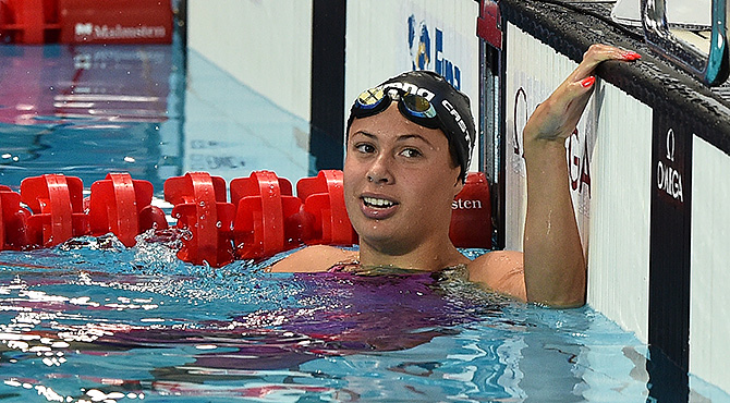 La seconda giornate di gare alla Kazan Arena si era aperta con due finali-spettacolo. Sarah Sjoestroem stabilisce il secondo record del mondo in due giorni abbassando il 55"74 nei 100 farfalla sino al 55"64. Terzo titolo mondiale consecutivo sulla distanza. Lontane tutte le avversarie con la danese Jeanette Ottesen, reduce dalla brutale aggressione subita lo scorso 26 giugno a Copenhagen dove ha riportato la frattura di un dito, ottima seconda tra le umane in 57"05.