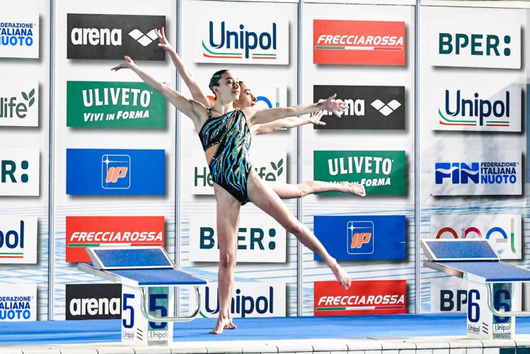 Lucrezia Ruggiero ed Enrica Piccoli, allenate per le Fiamme Oro da altre due stelle azzurre e super campionesse come Manila Flamini e Mariangela Perrupato, vincono la finale del duet femminile superando quota 300 e totalizzando 310.2567; subito dietro di loro Alessia Macchi e Sofia Mastroianni per la Marina Militare ottengono 294.6563 (Mastroianni d’argento anche nel 2025 in coppia con Marta Iacoacci) e terze sono le gemelle dell’Aurelia Nuoto Gaia Cupaioli e Giorgia Cupaioli, campionesse d’Italia l’anno scorso, con 286.9183 punti.