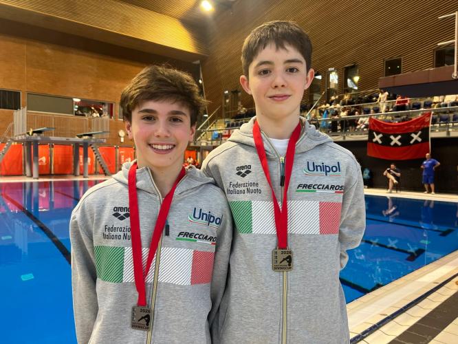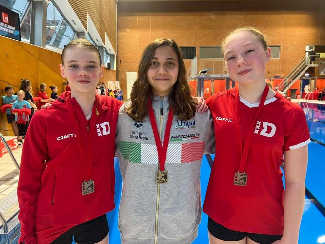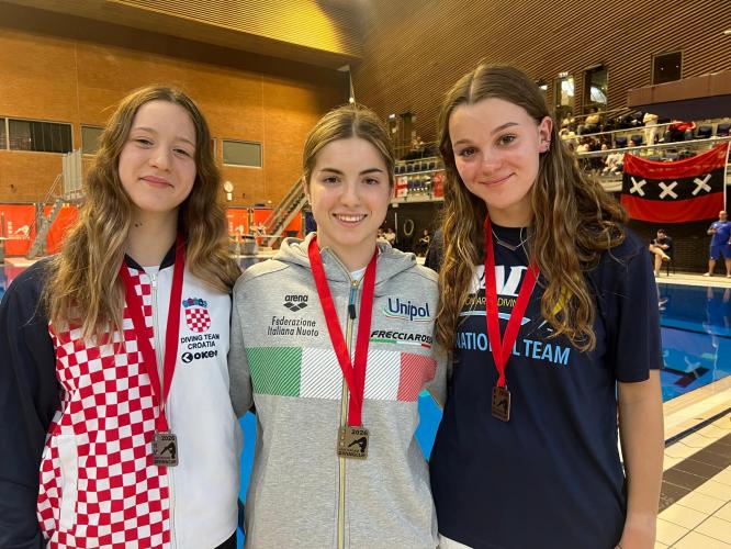 Il bottino azzurro arriva a 13 medaglie. Nella terza giornata dell'Amsterdam Diving Cup gli azzurri ne conquistano altre 4 che si aggiungono alle 9 di giovedì e venerdì. Tripletta d'oro con Sofia Conte con 374.30 punti dai tre metri juniores, Aurora Mahnic con 296.85 nella piattaforma ragazze e Alessandro Cafiero con 343.55 nella piattaforma juniores; medaglia d'argento di Tommaso Scaramucci con 302.95, alle spalle di Cafiero dalla piattaforma. I boys e girls guidati da Nicola Marconi a fine giornata mostrano orgogliosi tutte le loro medaglie (nella foto). Domenica c'è l'ultimo turno del meeting, ma gli azzurri non hanno gare e si rientra in Italia.