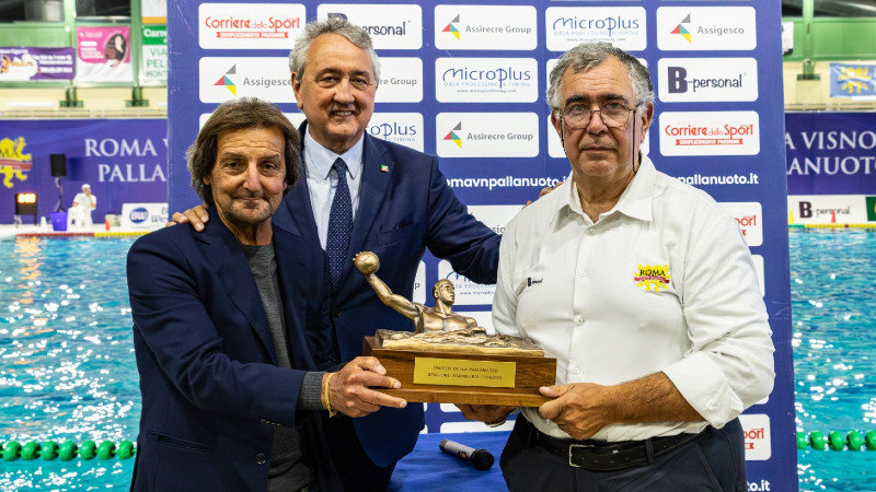 “I premi si consegnano e si celebrano. In questo caso rispecchiano i risultati eccezionali raggiunti dalla Roma Vis Nova Pallanuoto in tutte le categorie della pallanuoto. Complimenti – afferma il Presidente della FIN Paolo Barelli - E complimenti ad entrambe le squadre che hanno interpretato una partita molto vibrante e combattuta. Un plauso alle due società, così come a tutte le altre società italiane ed ai propri dirigenti, che vanno salutati da tutto il Paese per le grandi capacità di gestione degli impianti, nonché di promozione e sviluppo delle discipline acquatiche”. Insieme al Presidente Barelli, premia il Presidente del Comitato Regionale Lazio della FIN Gianpiero Mauretti.